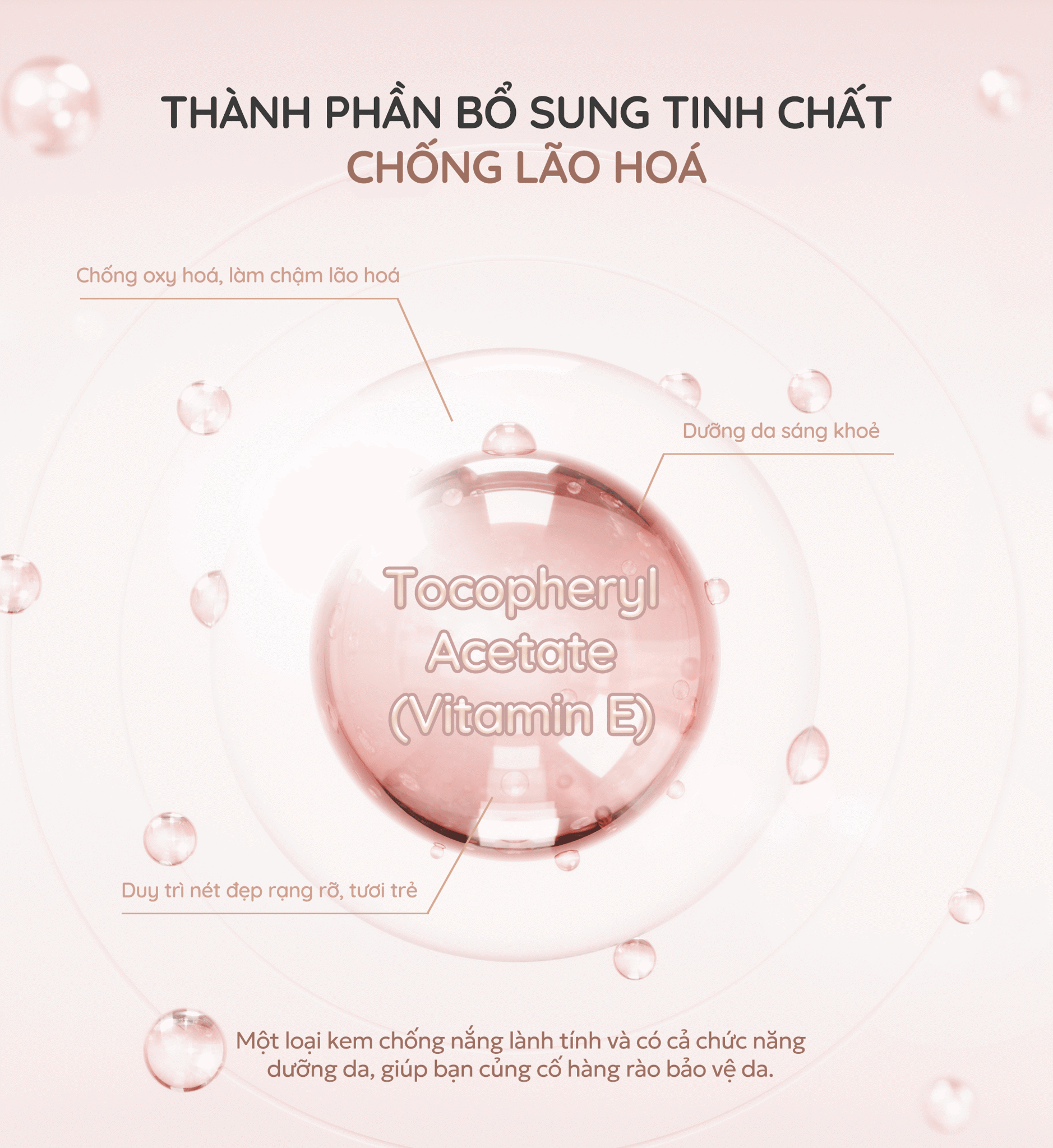 Vitamin E là thành phần dưỡng da thiết yếu trong kem chống nắng, mang lại nhiều lợi ích cho da, đặc biệt là da khô, da nhạy cảm và da lão hóa. Sử dụng kem chống nắng có chứa Vitamin E giúp bảo vệ da toàn diện khỏi tác hại của tia UV, ngăn ngừa lão hóa da và duy trì vẻ đẹp rạng rỡ. Vitamin E là người bạn đồng hành tuyệt vời cùng với bộ đôi Titanium Dioxide và Zinc Oxide, mang đến cho bạn hiểu quả bảo vệ da tốt nhất.